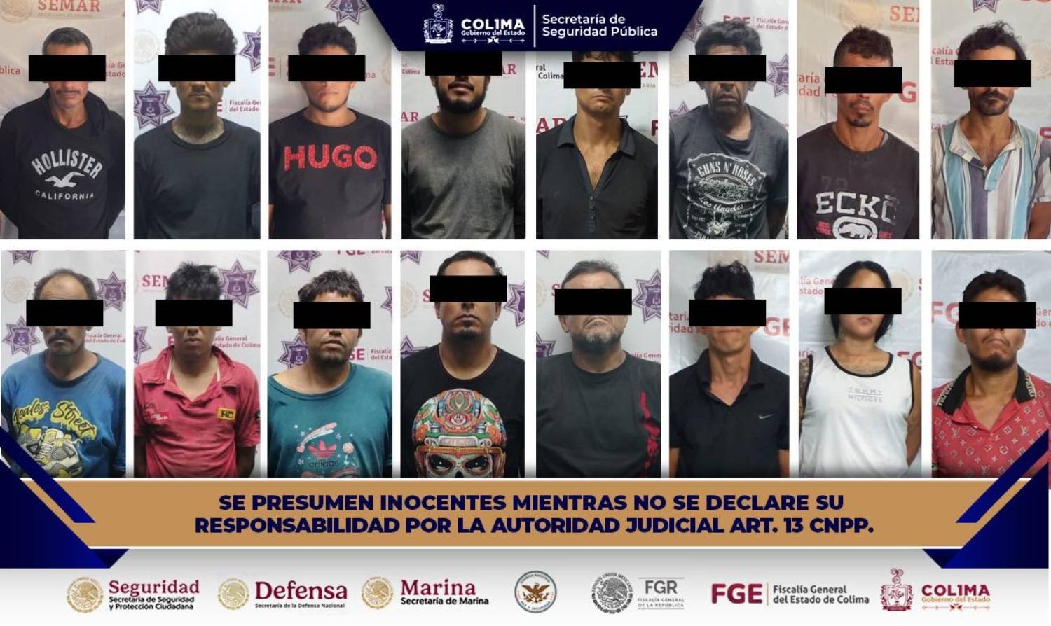 En seguimiento a las labores operativas que la Secretaría de Seguridad Pública (SSP) del Gobierno del Estado de Colima realiza de manera coordinada con autoridades federales, estatales y municipales, durante el fin de semana se llevaron a cabo intervenciones en los municipios de Colima, Manzanillo y Tecomán, que derivaron en la detención de 16 personas por su presunta participación en delitos contra la salud.