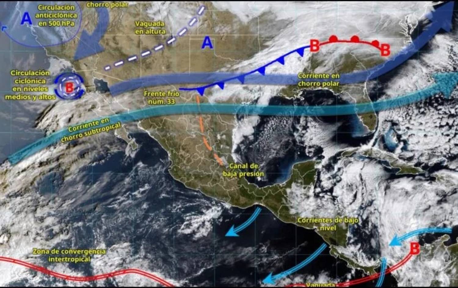 Para este jueves 5 de febrero, el Servicio Meteorológico Nacional (SMN) advierte que el frente frío 33 se desplazará sobre el sureste mexicano. La interacción de su masa de aire polar con la entrada de humedad del Pacífico generará un escenario de clima extremo en diversas regiones: