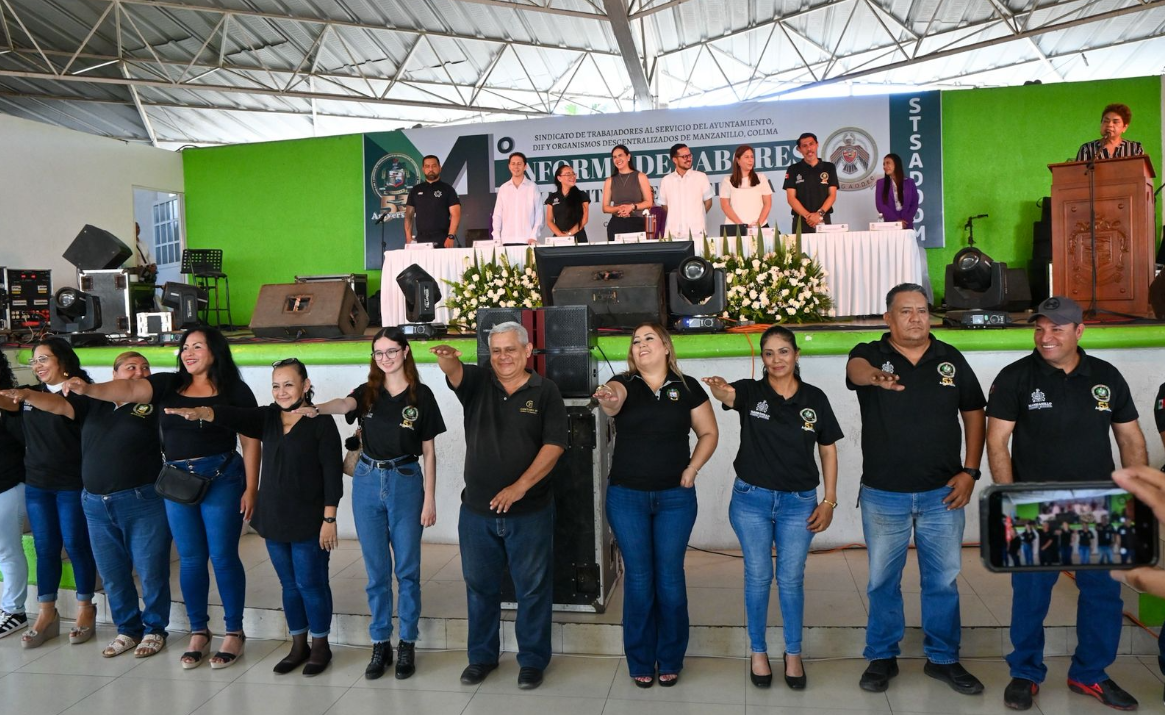 La alcaldesa de Manzanillo resalta el cumplimiento puntual de pagos y el reconocimiento de nuevas prestaciones tras asistir al informe de labores de la secretaria sindical Vitnia Peña.