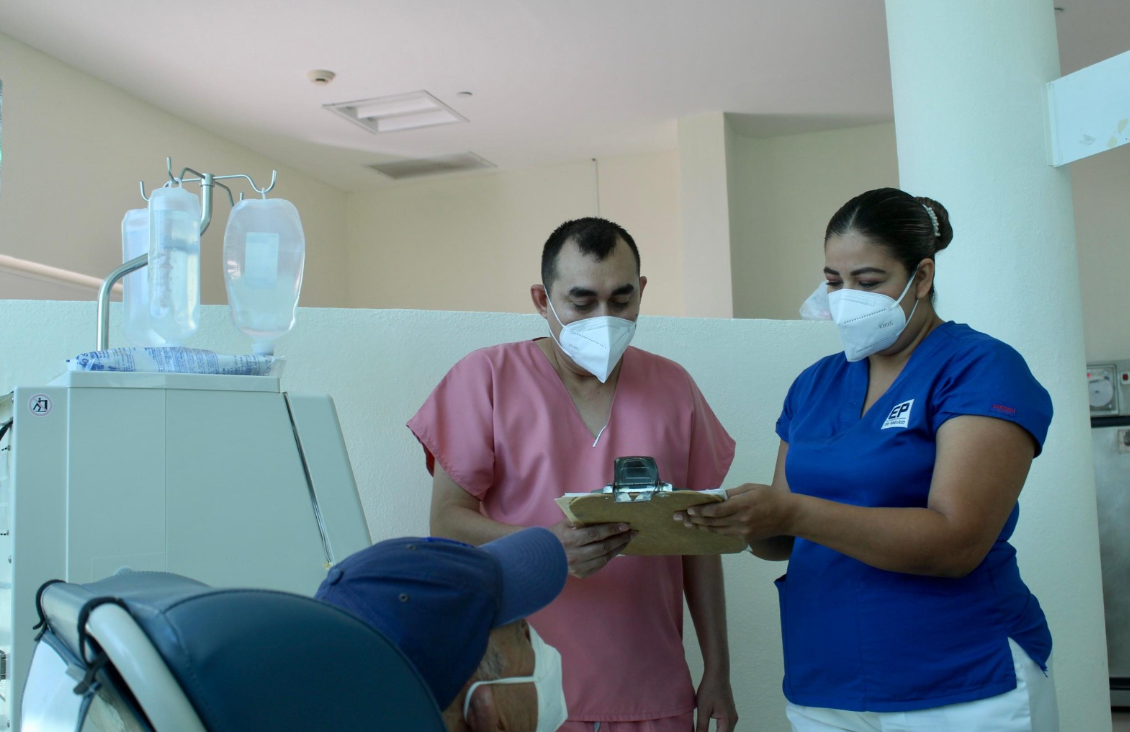 Mencionó que, fortaleciendo el servicio, se proporciona el tratamiento de hemodiálisis, medicamentos esenciales como hierro, vitaminas y colocación de catéteres cuando pacientes lo requieren. Cuenta con personal altamente calificado, integrado por especialistas en nefrología, angiología, oftalmología, medicina general e internistas, así como servicios integrales de rehabilitación.