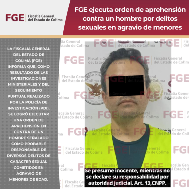+ -La Fiscalía General del Estado de Colima (FGE) concretó la detención de David Michel “N”, de 42 años, tras ejecutar una orden de aprehensión por su probable responsabilidad en una red de delitos sexuales.